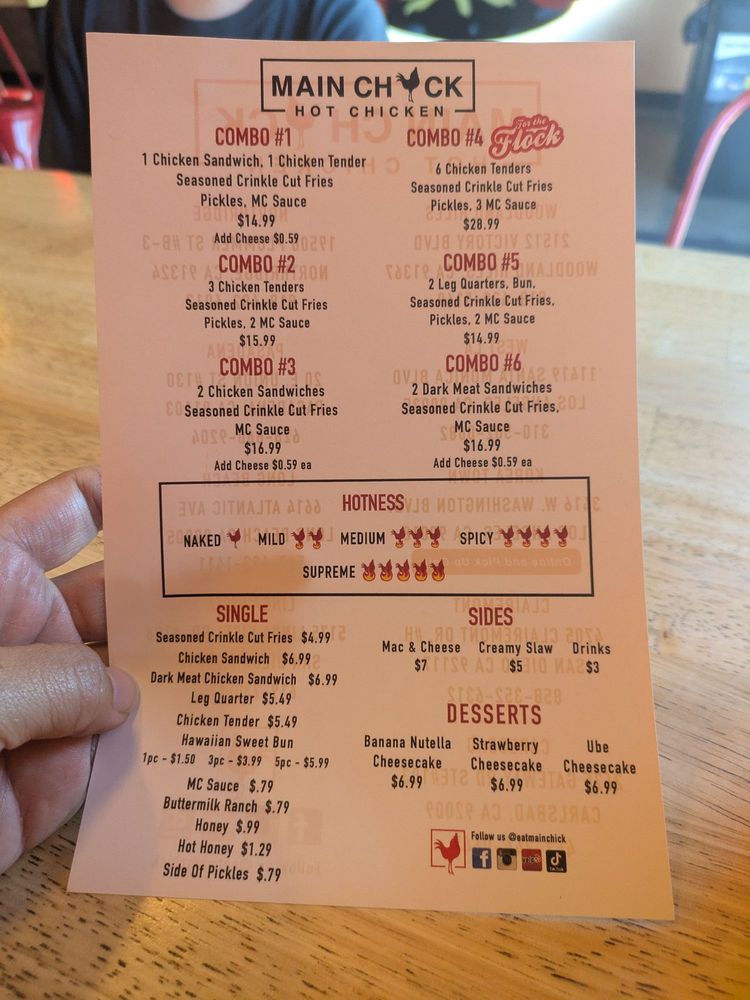 Introducing Main Chick, a must-visit chicken shop located in Carlsbad, CA, offering a menu packed with flavor and variety. Customers rave about the exceptional service and clean ambiance provided by the welcoming staff, like Sam, who goes above and beyond to ensure a pleasant dining experience. The hot chicken options, ranging from mild to Supreme spice levels, cater to all preferences, with options for those who prefer milder flavors as well. The signature chicken sandwich is a standout, earning high praise for its deliciousness. Not to be missed are the perfectly seasoned fries, a crowd-favorite side dish. Whether you're a spicy food enthusiast or seeking a more mild option, Main Chick has something for everyone to enjoy. With a chill atmosphere and great music, this restaurant is a hidden gem worth exploring.